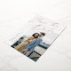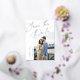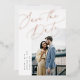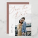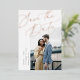 An elegant and simple save the date design featuring a vertical photo aligned at the lower left, with "save the date" at the opposite corner in rose gold foil calligraphy script lettering on a white background. Personalise with your names, wedding date, and location running vertically from the lower left corner, and add additional details, like your wedding website, to the reverse side.