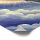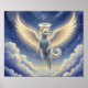 This poster features a digital painting of a majestic white angel cat with large, glowing feathered wings and a delicate, golden halo shimmering above its head. The cat floats gracefully in a mystical, deep blue night sky filled with a vast field of twinkling stars and a single, elegant crescent moon. Below the cat, soft and voluminous ethereal clouds swirl, illuminated by a celestial light that enhances the dreamy, otherworldly atmosphere.