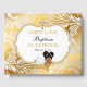 Beautiful baby girl in her christening dress and gold cross necklace sleeping on a gold pillow. Background is gold with silver scroll work and cross embellishment. Back is adorned with ribbon and cross.