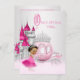 Ethnic Cinderella birthday party invitation with pink and silver diamond princess carriage and castle background with adorable African American Indian Hispanic ethnic little girl wearing a pretty pink dress with diamond tiara and pearls. This beautiful ethnic girls any number Cinderella pink and silver once upon a time princess birthday party invitation is easily customised for your event by simply adding your details in the font style and colour, and wording of your choice. This is a printed design with no real glitter, diamonds, pearls, etc.