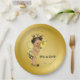 Bee baby shower paper plates with adorable Ethnic baby girl wearing a cute bumble bee outfit on a rich gold background with flying bumble bees. You can add text to personalise these black and gold bee baby shower paper plates, and you can remove the gold background to add the colour of your choice.
