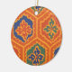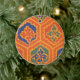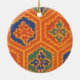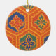 A round ornament with an ethnic pattern of floral tiles in orange, golden yellow, terracotta, blue and green, from a screenprint by Judy Adamson.