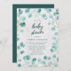 This baby shower invitation features eucalyptus leaves with the words "baby shower" in trendy script all against a pale marble background on the front and a dark teal green colour back side.