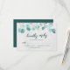 This wedding RSVP card features eucalyptus leaves with the words "kindly reply" in trendy script all against a pale marble background on the front and a dark teal green colour back side.