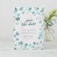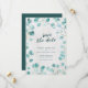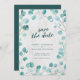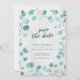 This save the date features eucalyptus leaves with the words "save the date" in trendy script all against a pale marble background on the front and a dark teal green colour back side.