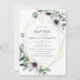 Trendy geometric eucalyptus greenery and poppy flowers in pastel shades baptism, christening or dedication invitation with gold geometric frame and mint watercolor wash reverse.