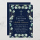 Eucalyptus baptism invitation. Watercolor eucalyptus flower with gold leaves and a dark blue background. Invite your loved ones to witness and celebrate a sacred baptism with our beautifully designed eucalyptus flower baptism invitation.