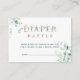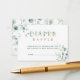 This baby shower diaper raffle enclosure card features painted watercolor eucalyptus and green leaves with botanical gold letters.