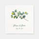 Elevate your wedding table decor with these exquisite napkins, featuring a beautiful illustration of a eucalyptus branch and lush green botanical leaves. The delicate watercolor design creates an atmosphere of garden inspired elegance, blending pretty foliage with a touch of timeless sophistication. The minimalist layout ensures a clean and refined look, making these napkins perfect for contemporary, rustic, or nature themed weddings.