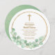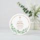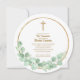 Elegant *round first communion invitations feature a gold faux glitter cross, a eucalyptus leaf wreath and your details in chic lettering. Perfect for your child's first communion, baptism or christening. MATCHING items available in our collection. *Round size takes extra postage - mail in a 5" x 7" envelope for regular postage.