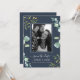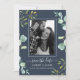 Elegant, simple photo wedding save the date invitation with green eucalyptus botanical design on a chic navy blue background you can customise with your engagement photo. Simply add your upcoming wedding details. If you need any help or matching products, please contact us through our store. We're happy to help you make your wedding the most beautiful day!