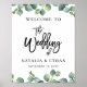Watercolor silver dollar eucalyptus foliage, wedding welcome poster.
