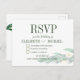 A floral wedding RSVP card featuring eucalyptus foliage. Green with white flowers.