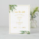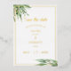 Your romance is evergreen. This vibrant gold foil Save The Date card features a real gold frame with painted eucalyptus leaves in the corners over a white background. Within the frame, your names and wedding details are displayed in real gold foil elegant fonts. The backside features eucalyptus leaves over a simple light green background. Some images are also removable.
