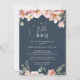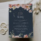 This eucalyptus garden floral "I Do" BBQ engagement party invitation is perfect for a modern engagement party, rehearsal dinner, couples shower, after party or any wedding event. The design features pink, blush, yellow rose flowers with eucalyptus leaves in a dark navy blue background.