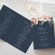 This eucalyptus garden rose floral folded wedding program is perfect for a rustic wedding. The design features pink, blush, yellow rose flowers with eucalyptus leaves in a dark navy blue background.