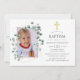 Trendy watercolor eucalyptus silver dollar baptism, christening or dedication invitation with gold geometric frame. A portrait shaped photo is recommended.