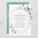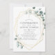 Trendy watercolor eucalyptus silver dollar confirmation invitation with gold geometric frame.