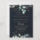 This eucalyptus gold floral blue Spanish wedding invitation is perfect for a rustic wedding. This artistic design features hand-drawn gold floral and watercolor eucalyptus green foliage in a dark blue background, inspiring natural beauty.