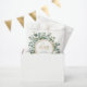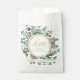 Here you may accomplish a sweet addition to your wedding personalising this minimal cute favour bag that features, our collection's associated design of a delicate eucalyptus wreath and gold glitter around to play with your initials above the wedding date and location.