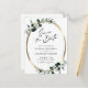 Eucalyptus Gold Modern Calligraphy Wedding Save the Date Announcement Postcard... Our luxe botanical Save the Date postcard features a faux gold metallic oval frame embellished with dusty green and emerald-hued eucalyptus leaves creating a natural looking border for the announcement text within. The back of the card contains your return address, wedding website information, and a QR code graphic template you can easily replace by typing in your wedding website URL right on the personalisation template. All example text on both sides of the card (aside from the calligraphy elements) can be easily revised with your own details on the same personalisation template.