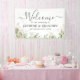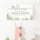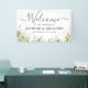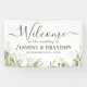 Botanical wedding welcome banner featuring a stylish white background, watercolor green eucalyptus foliage, gold glitter accents, and a wedding text template that is easy to personalise.