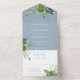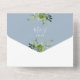 This all-in-one dusty blue wedding invitation features botanical greenery falling across elegant typography. The invitation includes a perforated RSVP card that can be individually addressed or left blank so you can handwrite your guest's address details. Designed by Thisisnotme©