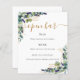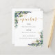 A chic white background. Decorated with green watercolored eucalyptus leaves, sprigs, greenery, faux gold leaves and golden glitter spots. With the text: Open bar. Personalise and add your bar menu. Black and golden letters.