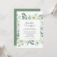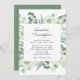 This elegant wedding invitation features a thick border of lush greenery, eucalyptse and flowers. The design is accented with handwritten style text for the names of the bride and groom.