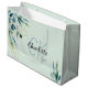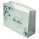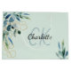 A light green background. Decorated with watercolored eucalyptus and olive greenery, and golden foliage. Personalise and add a name. The name is written with a modern hand lettered style script.