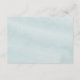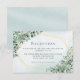 This watercolor eucalyptus wedding reception details card features a gold geometric frame decorated with botanical bouquets of greenery, with a dusty blue watercolor texture on the back.