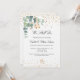 A chic white background. Decorated with green watercolored eucalyptus leaves, sprigs, greenery and a faux gold sprig. Golden hearts sprinkle. Personalise and add your names and ceremony details. Black letters.