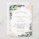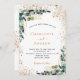 A white background decorated with eucalyptus greenery and golden foliage. Personalise and add your names and wedding details. Black and golden coloured letters.