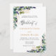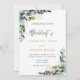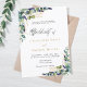 A white background decorated with watercolored eucalyptus greenery, lavender florals and golden foliage. Personalise and add your names and wedding details. Black and golden coloured letters.