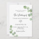 A white background decorated with eucalyptus greenery sprigs. Personalise and your name and ceremony details. Black coloured letters.