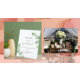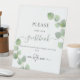 White background. Decorated with watercolored eucalyptus greenery. With the text: Please sign our guest book. Black and green letters. Mr and Mrs with a heart.