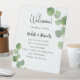 A modern, elegant, wedding program, timeline. White background, decorated with eucalyptus greenery, sprigs. Personalise and add your names and wedding details. Black coloured letters. If you have more text it's possible to reduce the line space.