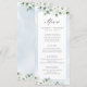 Modern chic watercolor white floral eucalyptus greenery and gold colour border frame on dusty blue background, with trendy menu script, elegant and stylish, great wedding menus for rustic wedding, botanical wedding and beach wedding in spring and summer.