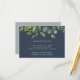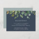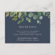 Designed to coordinate with our Eucalyptus Grove wedding collection, this lush botanical reception card features a spray of watercolor leaves and green eucalyptus foliage, topping your reception details, timing and address, in white on a smoky navy blue background.