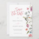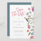 Colourful watercolor flowers mixed with eucalyptus leaves create a beautiful floral border for this customisable Save the Date wedding invitation.