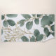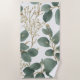 This design features eucalyptus leaves and branches on a white background. The design has a flat, graphic style and a soft green and gold colour scheme. The pattern is composed of leaves and branches arranged in a different direction.