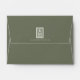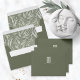 With a colour palette from ivory to spring green and dark moss, this wedding collection features a handwritten script font and eucalyptus leaf accents to add that wonderful modern touch. The coordinating envelope shown here has a striking leaf pattern interior in light sage, and a darker moss green exterior topped by your initials and wedding date in a white-trimmed frame. Background colours are all changeable to suit your needs. Search ID901 to see other colour choices and coordinating pieces for this unique wedding collection.