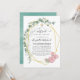 Trendy geometric eucalyptus greenery and blush pink roses online long distance virtual wedding ceremony invitation with gold geometric frame and mint watercolor wash reverse.