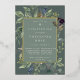 Chic botanical invitation for baptisms, christenings, or baby dedications features a border of lush sage green botanical leaves and watercolor eucalyptus foliage with gold foil trim. Personalise with your ceremony and party details in modern lettering on a tone on tone moss green background.
