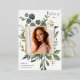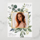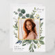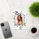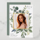 Our Eucalyptus & Sage graduation announcement frames a photo of your graduate with an elegant square border of lush watercolor eucalyptus and sage green leaves, with real gold foil trim on a crisp white background. Personalise with your graduate's class year, name, and school. Add a personal message to the back, along with an additional photo.