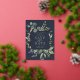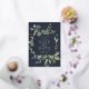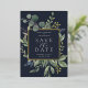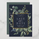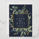 Our Eucalyptus & Sage wedding save the date frames your wedding details with an elegant square border of lush watercolor eucalyptus and sage green leaves, with real gold foil trim on a midnight blue background.