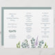 Eucalyptus folded wedding program template.  Fold like an accordion to use for the ceremony.  A little spray of blue-grey leaves decorates the front (left side panel) just beneath the names of the couple.  More greenery and a sprig of lavender "grow" up from the bottom of white paper.  Reverse is solid grey-blue colour.