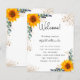 A modern, elegant, wedding program, timeline. A chic white background. Decorated with sunflowers, green watercolored eucalyptus leaves, sprigs, greenery, faux gold leaves and golden glitter spots. Personalise and add your names and wedding details. Black coloured letters. If you have more text it's possible to reduce the line space.