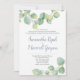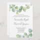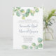 This elegant botanical wedding invitation features a watercolor painting of greenery on a crisp white background. The bride and grooms names are set in a grey blue ink. Your wedding details are draped with abundant green branches of eucalyptus leaves in a vibrant painted watercolor by Victoria of VG Invites. To see more, visit www.zazzle.com/vginvites