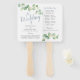 This elegant botanical wedding program fan features my original hand painted painted watercolor eucalyptus leaves. The greenery is done in shades of green tones on a crisp white background. The bride and grooms names and wedding program timeline are set in hand lettered script and sans serif typography. This double sided ceremony program design is a botanical choice for rustic barn weddings, country weddings and garden weddings. Designed by Victoria of VG Invites. To see more, visit www.zazzle.com/vginvites